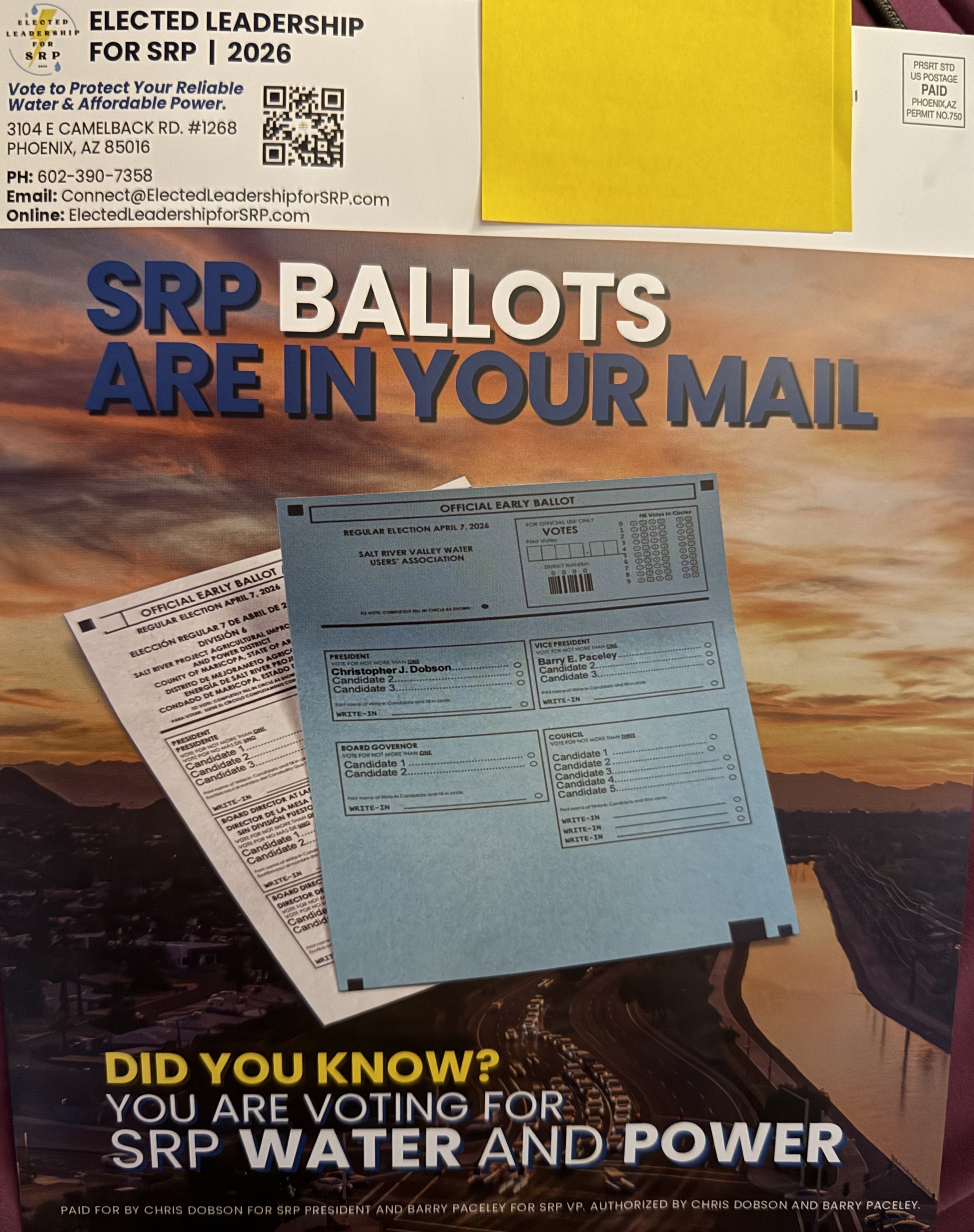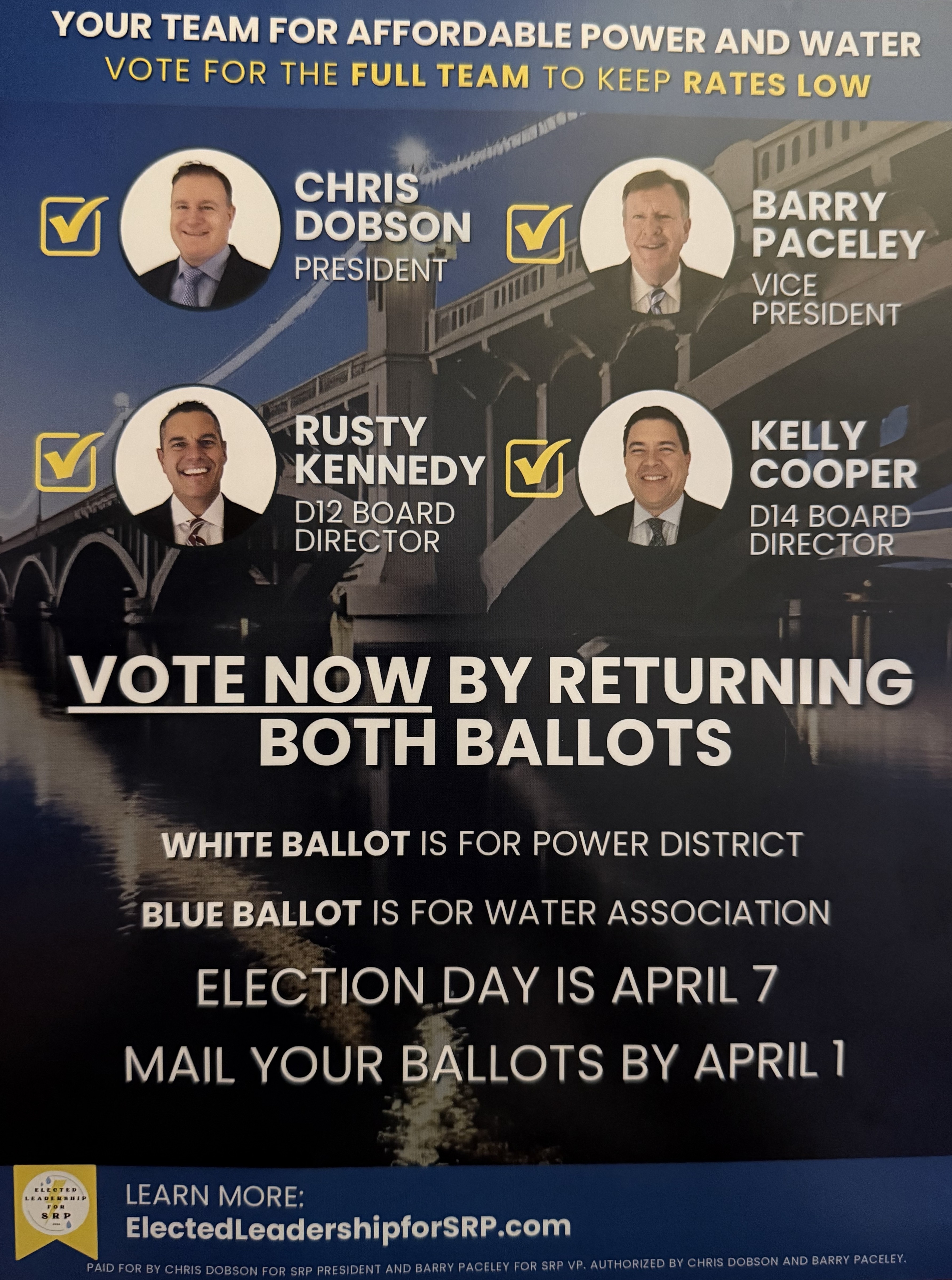 GOTV Mailer sent to SRP customer in support of "Elected Leadership for SRP" slate: Chris Dobson, Barry Paceley, Rusty Kennedy, Kelly Cooper.
