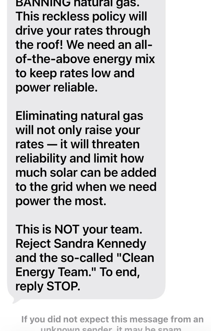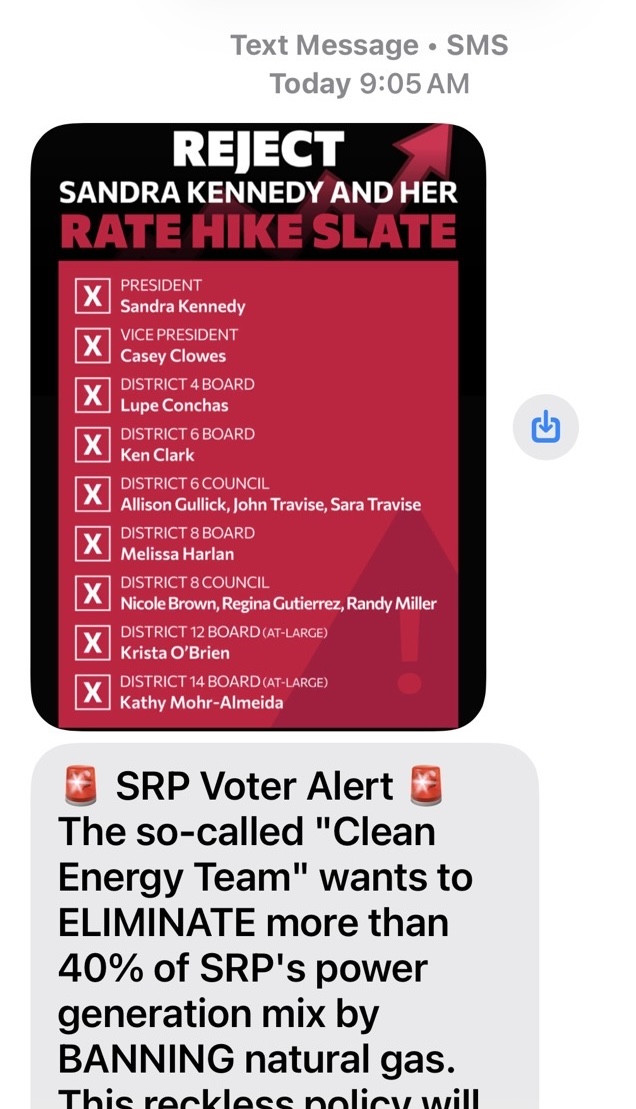 Text received by SRP customer sent anonymously in opposition of Sandra Kennedy and the "Clean Energy Team" slate: